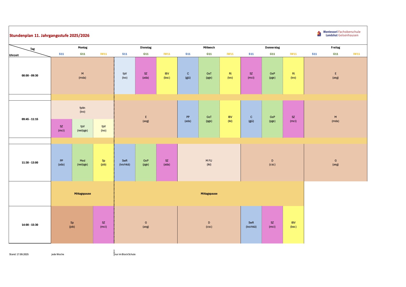 Der exemplarische Stundenplan für die 11. Jahrgangsstufe zeigt die Tagesstruktur in den beiden Ausbildungsrichtungen Gestaltung und Sozialwesen. Der Stundenplan am Montag läuft das gesamte Schuljahr. Dienstag bis Freitag wechseln sich Phasen der fachpraktischen Ausbildung und den Schülblöcken ab. Beachtet hierbei den Jahresplan fachpraktische Ausbildung.
